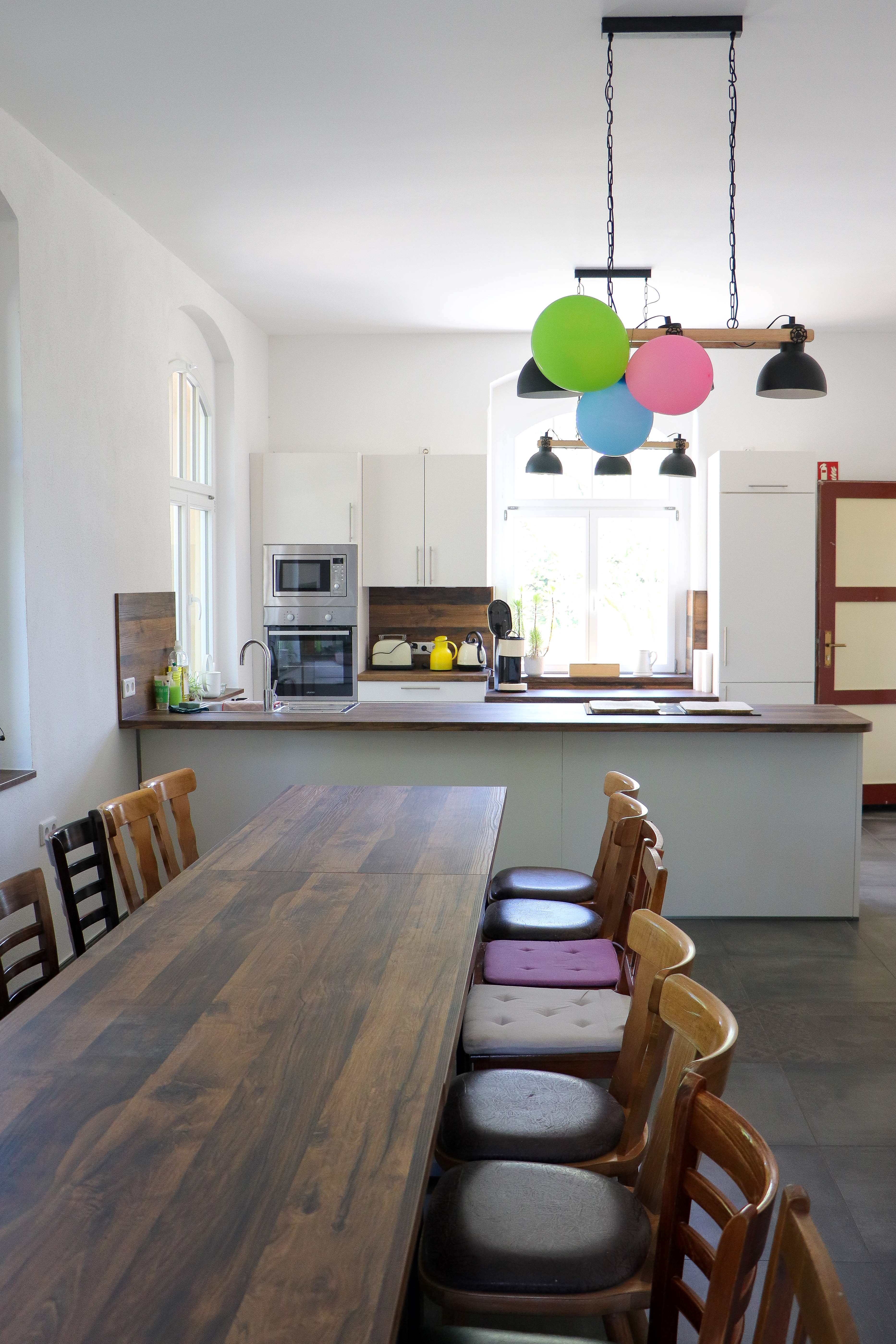 Die moderne Küche lädt zum gemeinsam kochen und backen ein. Für Projekte und Feiern gibt es genug Geschirr und Gläser. In der Küche befindet sich auch eine kleine Bar mit Zapfanlage.